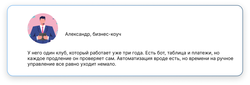 Каждый месяц эксперты отправляют ссылки, напоминают о продлениях, добавляют и удаляют участников. От этого страдают время, энергия, вовлеченность аудитории и стабильность дохода.
