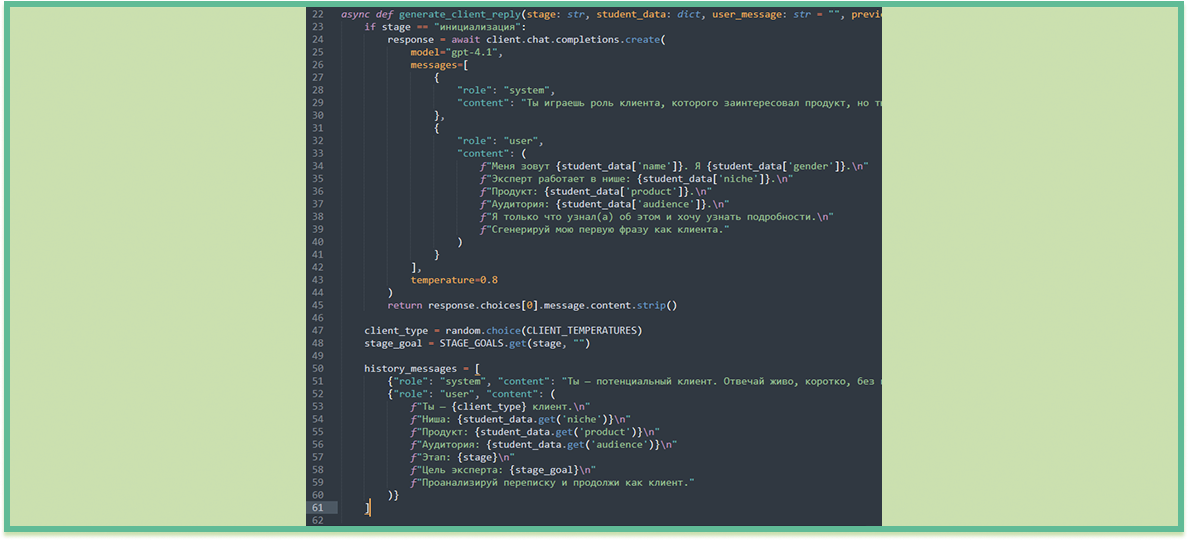 1. Настроили обработку сообщений: бот принимает сообщения менеджера, отправляет их в модель и возвращает ответы клиента.