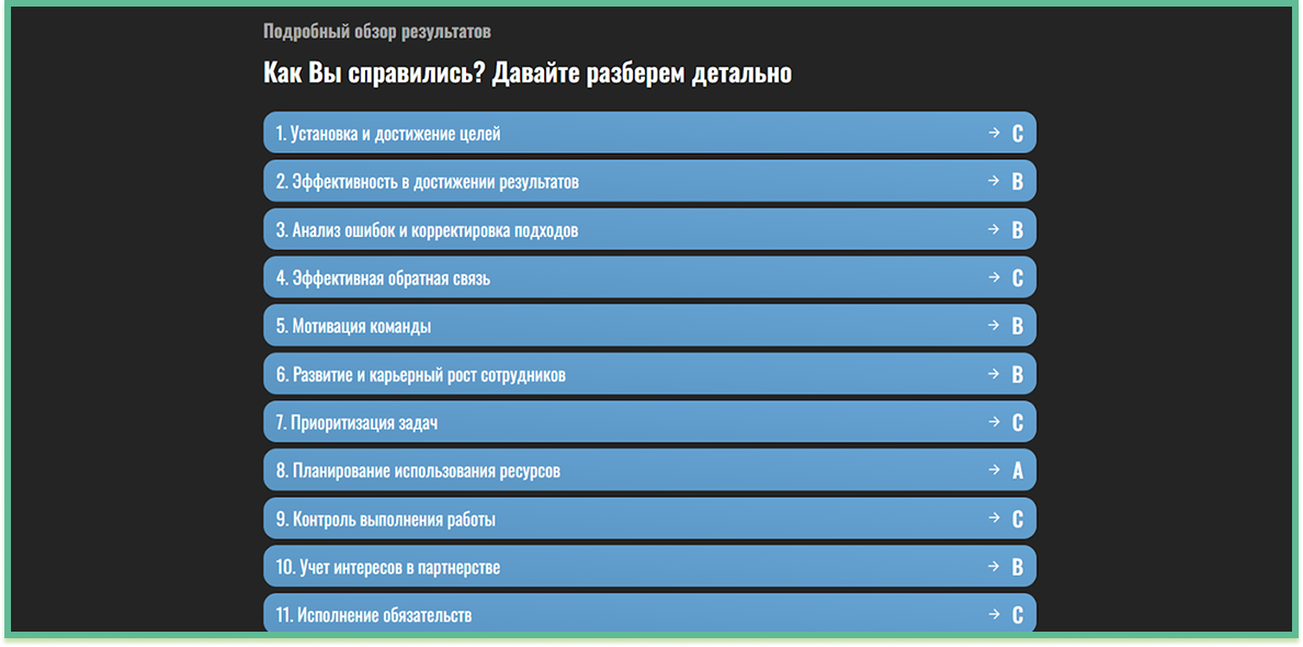 В конструкторе Prodamus XL создали страницу, оформили в фирменном стиле компании. Каждый участник получает индивидуальный результат с подробным разбором ответов.