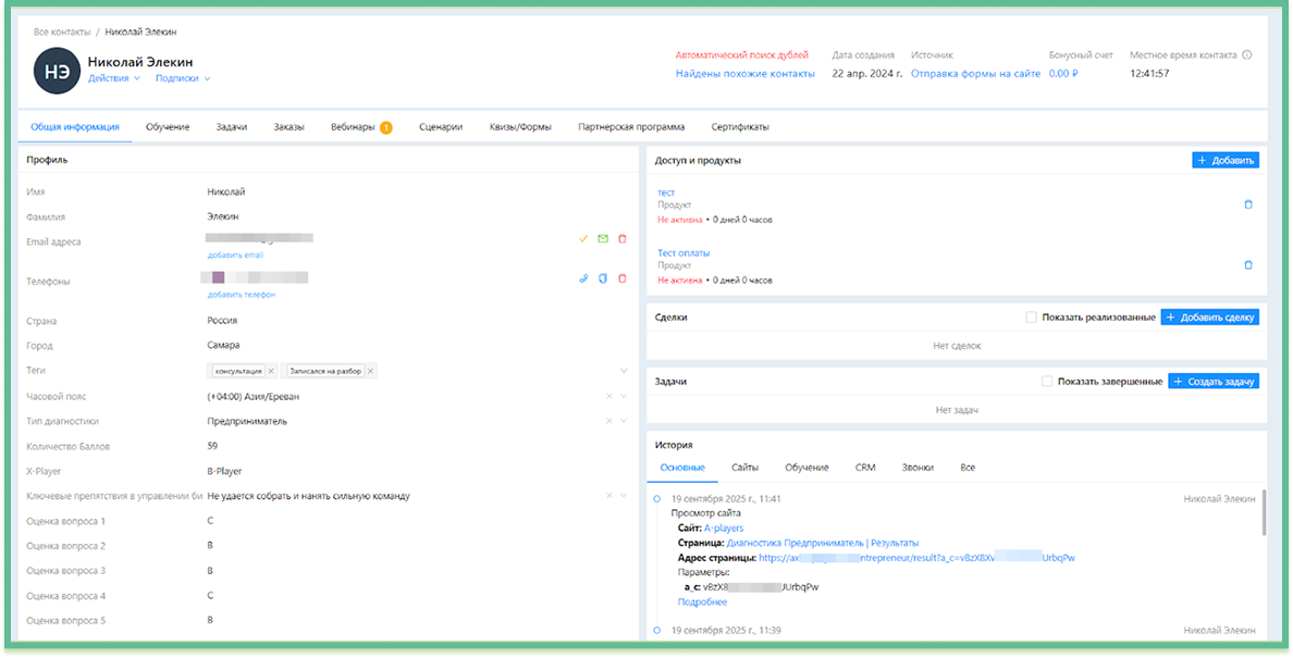 Все ответы, баллы и персональная ссылка на результат сохраняются в карточке клиента.
