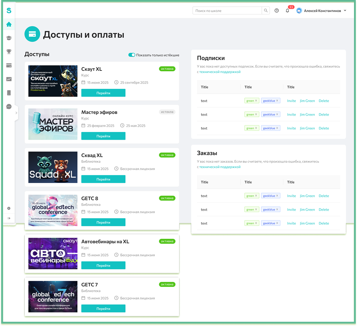Пример экрана с доступами и оплатой курсов: