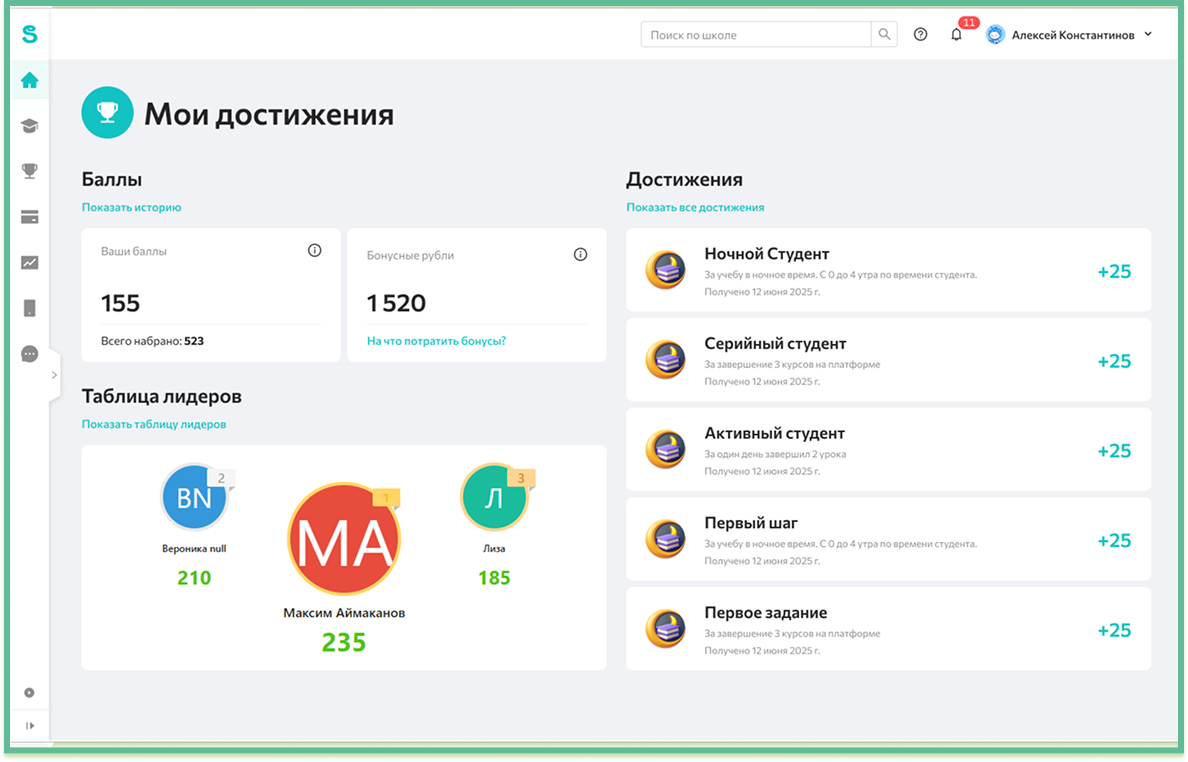 Пример экрана с достижениями студента в личном кабинете:
